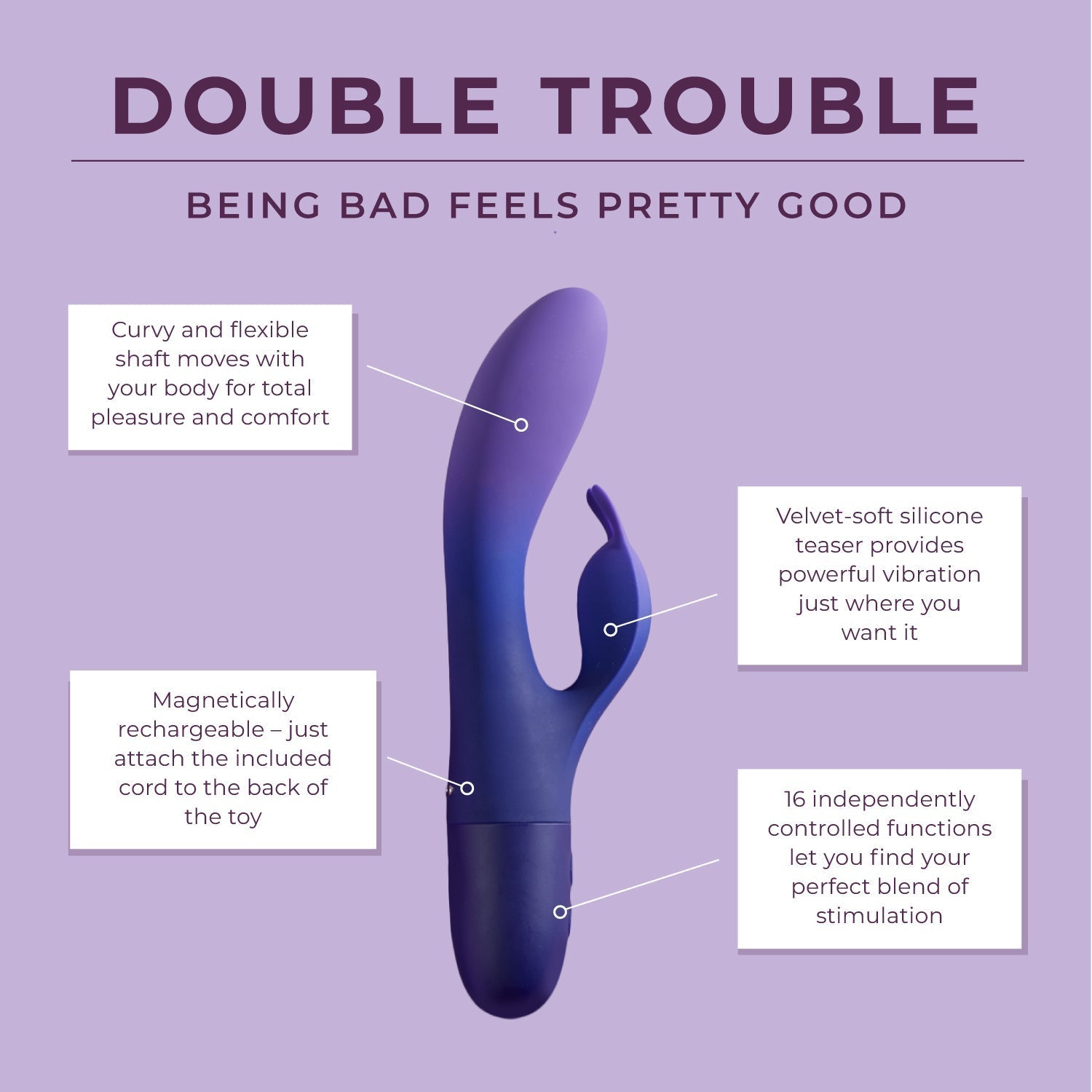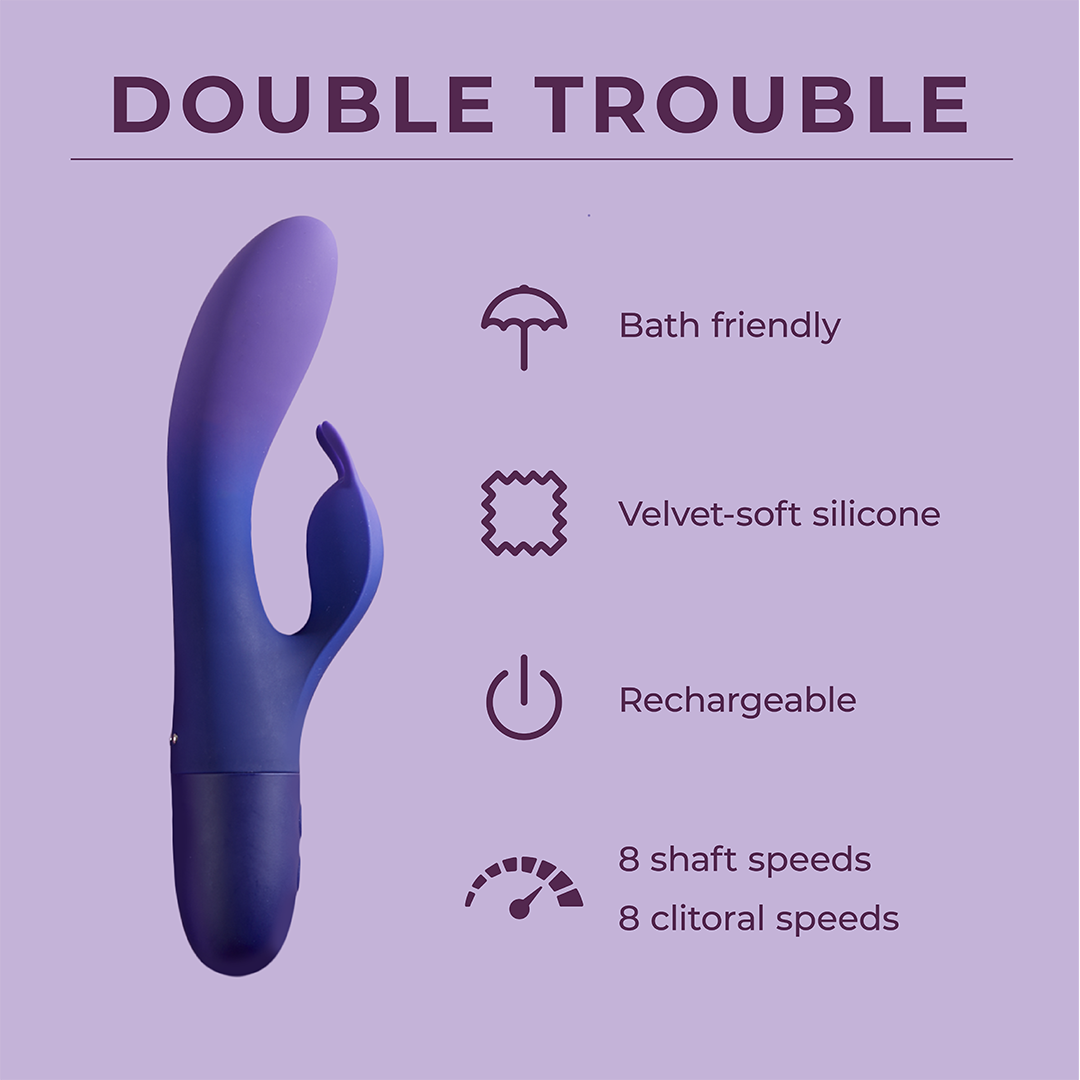 Who doesn't love a little drama? Well, prepare for trouble and make it double. This flexible dual-action vibe will give you a double dose of irresistible pleasure with independently controlled motors in the shaft and clitoral teaser. Each motor boasts 8 progressive speeds of vibration for a total of 16 mix-and-match ways to stir up a little bedroom drama.