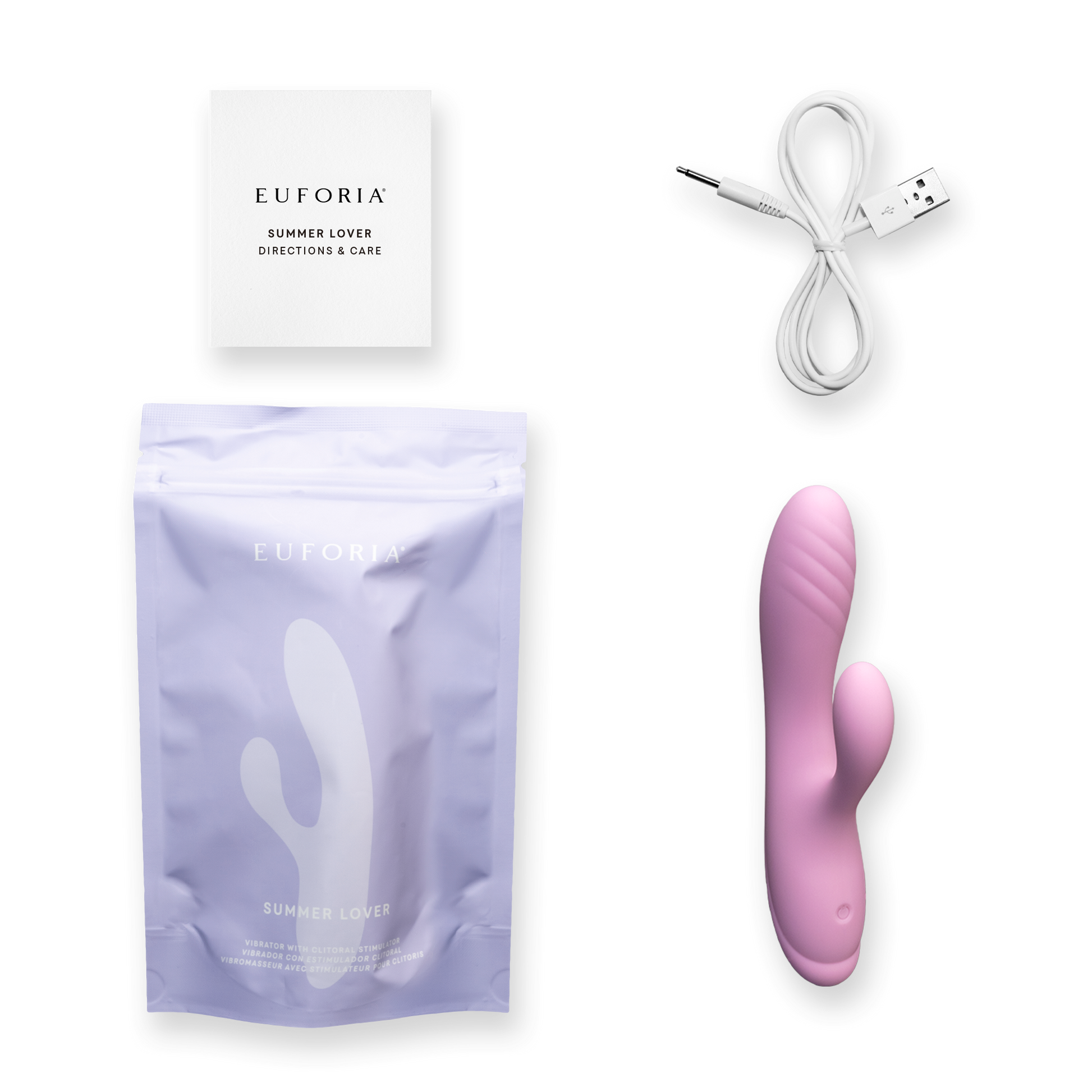 This dual-action vibrator offers up a silky-smooth feel that is endlessly inviting to the touch with a curved, ergonomic handle and a subtly rippled shaft. Summer Lover features three speeds and five rhythmic patterns of powerful vibration that simultaneously stimulate the clitoris and G-spot for blended orgasmic bliss that will make this an affair to remember.Â